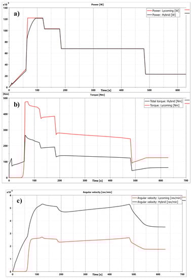Both model configurations were run in the training mission profile. Figure 20 shows the trends of the power, the torque and rotary speed that, for the hybrid configuration, were read before the speed reducer. In Figure 20, the “baseline” configuration is shown in red and the “hybrid” is shown in black.