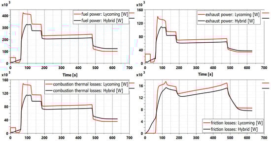 As already performed for the training mission profile, models of both configurations were run following the cruise mission profile. As expected, the values and the trends changed, although the concepts expressed regarding power, torque and speed were the same for this mission profile (Figure 23). The comparison was also performed for the fuel power, exhaust power, combustion thermal losses and friction losses, as shown in Figure 24.