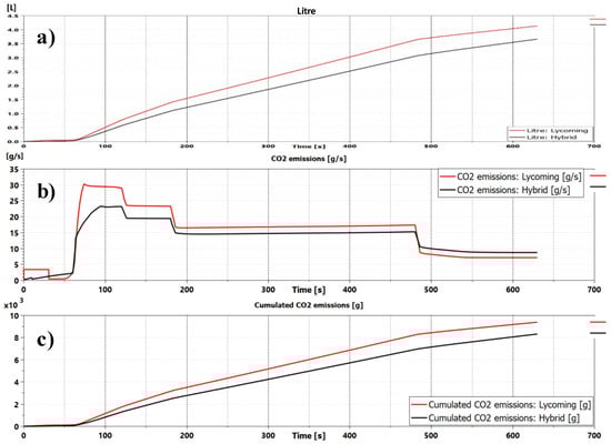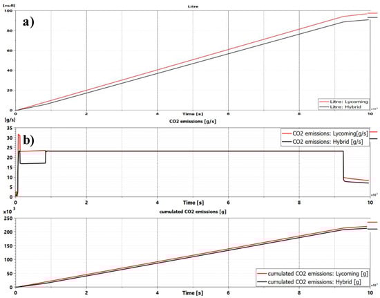 Figure 22a shows a comparison between the fuel consumption during the first cycle of the mission profile. Differences between the configurations have also been found for the other cycles (3–5). Other important data are shown in Figure 22b, which shows a comparison of CO2 emissions.