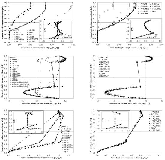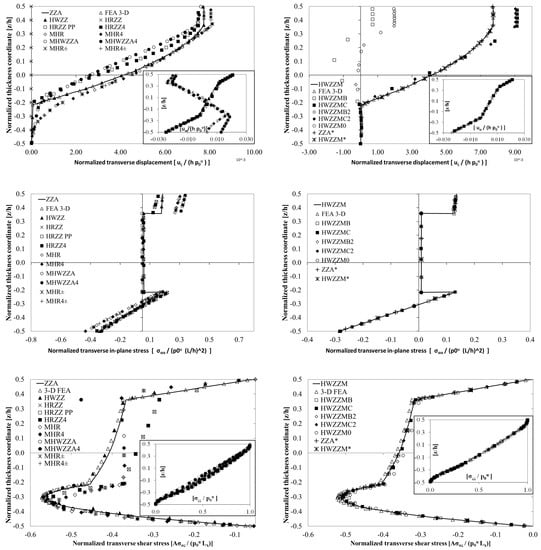 It is worth noting that in both cases i1 and i2, there is no detectable difference when the transverse displacement is evaluated in points across the thickness other than at the middle plane as reported in the tables and figures, because both structures are thin. However, splitting the core into two halves whose upper half is much more compliant than the lower one (case i3), similar as to when a face is damaged, and assuming Lx/h = 10 and a different orientation of layers of faces, the results of Figure 13 are obtained, which show visible differences between the results of the theories. Those assuming a uniform or a polynomial transverse displacement in this case don’t account properly for this effect, so less accurate results are obtained, see e.g., MHR±, MHWZZA, MHWZZA4, HRZZ, HRZZ4, FSDT, and HSDT.