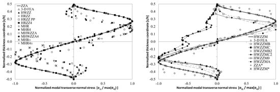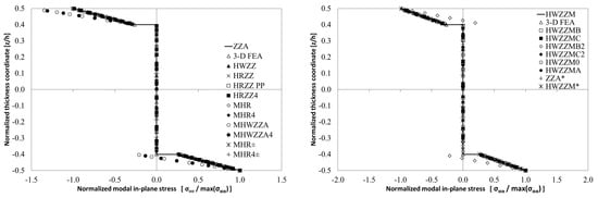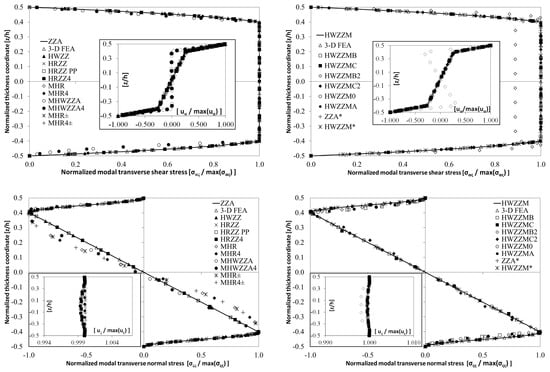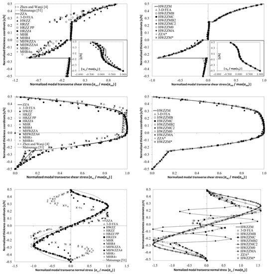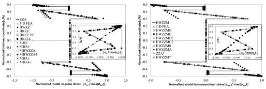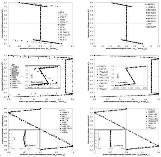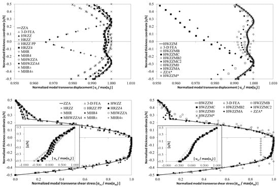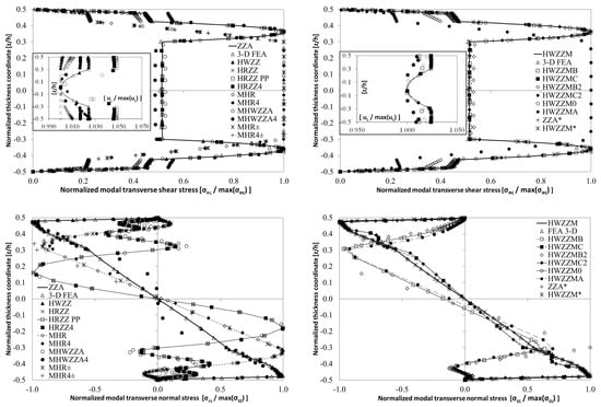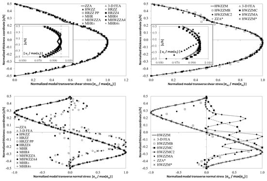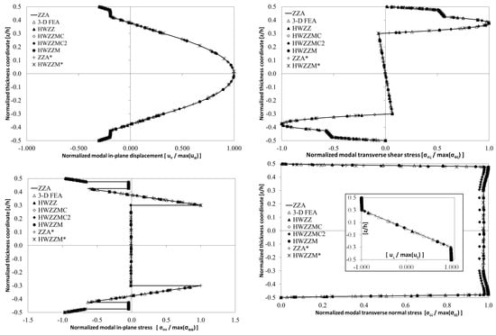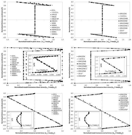 From Figure 9, which reports the in-plane modal displacement, in-plane and transverse shear modal stresses for the first mode, and a minor subject to errors, it can be seen that all of the theories except HWZZMA, MHR, MHR4, MHR±, and MHR4± obtain quite accurate results, which is a sign that Murakami’s theories are inappropriate for this case. However, it is noted that the greatest errors occur on the transverse modal displacement and the normal modal stress. Figure 10 reports the modal stresses and displacements for the third frequency by ZZA, ZZA*, HWZZA, HWZZM, HWZZM*, HWZZMC, and HWZZMC2, while the results by other theories are not reported as being too wrong.