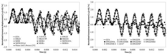 Anyway, MHWZZA4, MHR4, MHR4±, HWZZMA, and HWZZM0 still appear inaccurate, whereas the adaptive theories once again obtain results that are in very good agreement with 3D FEA. Table 20, which reports results for specific instants (0.9 ms, 4.5 ms, 5.6 ms, 6.5 ms, and 7.4 ms for i1 and 3.9 ms, 8.0 ms, 19.96 ms, and 24.08 ms for i2) show that the erroneous predictions (both frequency and amplitude of response are wrong) given by HRZZ, HRZZ4, HWZZMB, HWZZMB2, and HWZZMC2 are erroneous, which had not been noticed for the initial instant (0.9 ms for i1 and 3.9 ms for i2, which corresponded to the occurrence of the first peak of ZZA in each of the two cases) considered in Figure 11 and Figure 12).