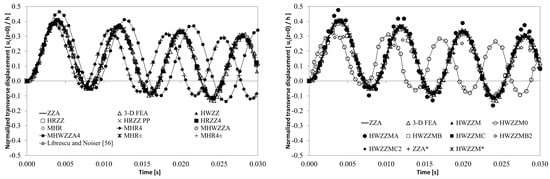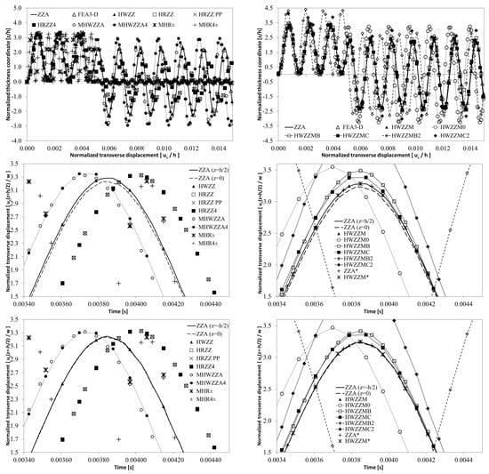 The results for the first case i1 are reported in Figure 11 as the central plate deflection at the mid-plane normalized to the plate thickness. It can be seen that also in this case, only theories ZZA, ZZA*, HRZZ, HRZZ4, and HRZZ4* provide a correct time-variation of the deflection, which is in good agreement with 3D FEA. Notice that the results by [54] differ from the FEM results because of the lower-order model used therein. However, we see a similar behaviour where errors tend to disappear with respect to the present theories if a single half-wave in the x and y directions is considered instead of the expansion order that is reported in Table 2.