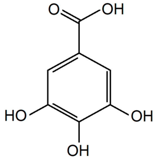 Other phenolic biomolecules, such as gallic acid, have also been considered as a potential source for bio-based epoxy thermosetting resins. Gallic acid or its derivatives are present in grapes, tea, gallnuts, oak bark, some fruits, vegetables, honey and can also be found in plant tissues [67,68,69,70,71]. The phenolic structure of gallic acid is shown in Figure 2.