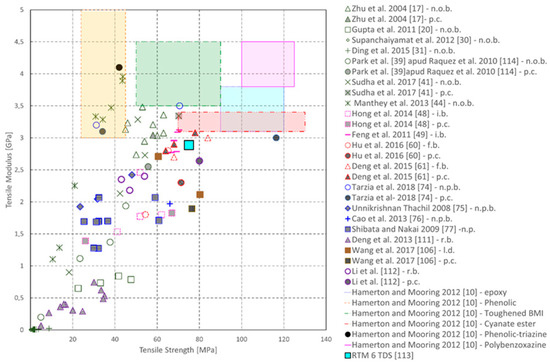 Thermosetting epoxy resins can currently encompass a wide range of properties depending on the curing agents and proportions, curing cycles and additives that can be added during their formulation [13]. This fact makes them suitable for many applications including the aerospace field. Epoxy thermosets typically used in aircrafts are based on diglycidyl ether of Bispehenol A (DGEBA). However, there are other epoxy compositions such as cycloaliphatic epoxy resins, trifunctional and tetrafunctional epoxy resins and novolac epoxy resins, although they are less used [7]. For thermosetting epoxies, the tensile strength ranges from 90 to 120 MPa with a tensile modulus ranging from 3100 to 3800 MPa [10]. Moreover, these systems usually have glass transition temperatures (Tg) that range from 150 to 220 °C, making it possible to use them as first and second aerospace resin systems [10].