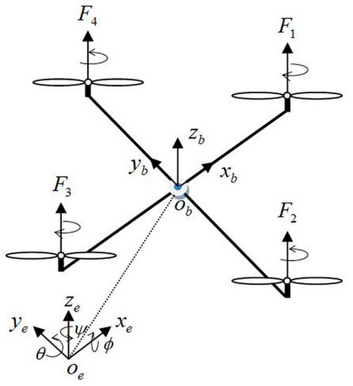 A schematic configuration of a quadrotor UAV system is depicted in Figure 1, where denotes an inertial frame and is a body frame fixed to the quadrotor; , and are, respectively, the roll, the pitch, and the yaw angles, such that , , and .