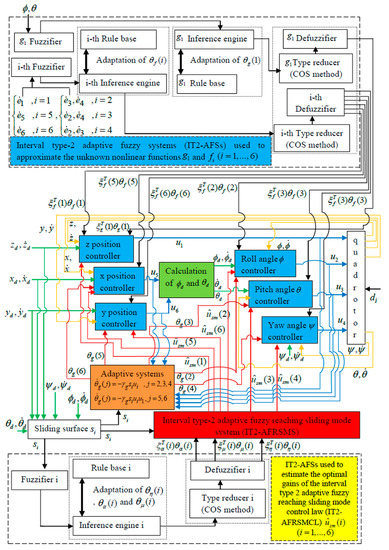 - By taking advantage of the properties of T2-FSs and adaptive control techniques in the design of robust controllers, seven interval T2 adaptive FSs (IT2-AFSs) and five adaptive systems are synthesized to better estimate the unknown dynamics and unknown parameters of the studied quadrotor.