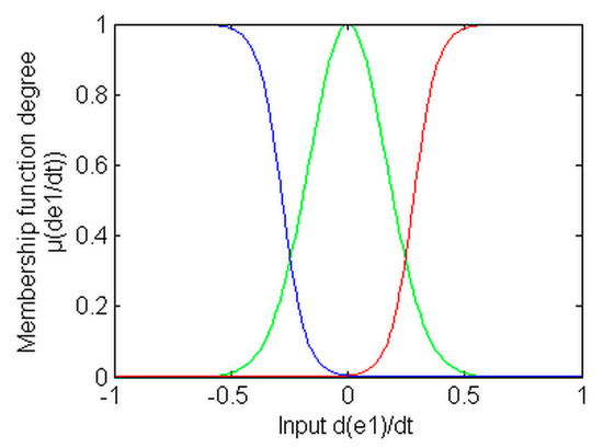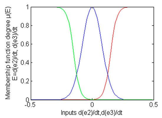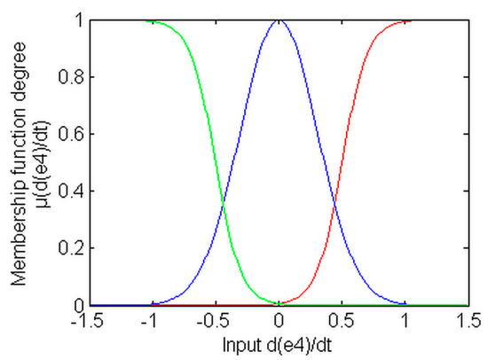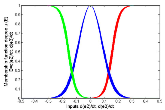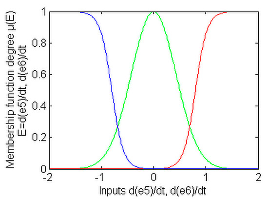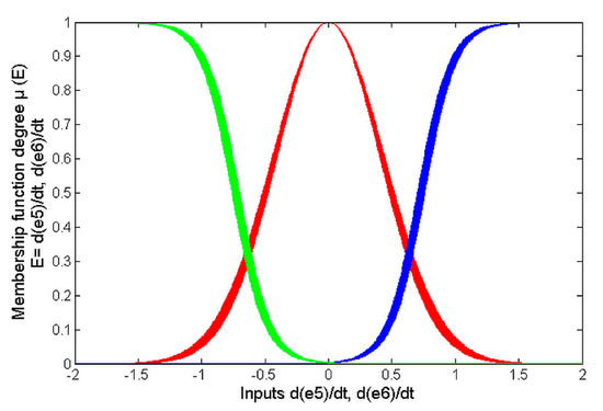 The MFs designed for are depicted in Figure 4; the MFs used by and are represented in Figure 5; the MFs used for the inputs and are shown in Figure 6; and the MFs designed for are depicted in Figure 7.
