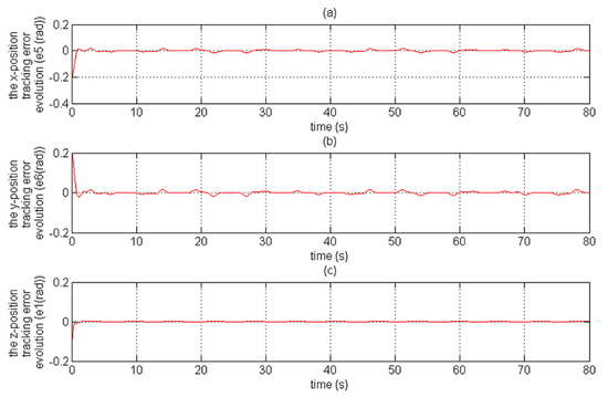 The position tracking errors obtained by the PTCM: (a) -position error (m); (b) -position error (m); (c) -position error (m).