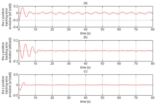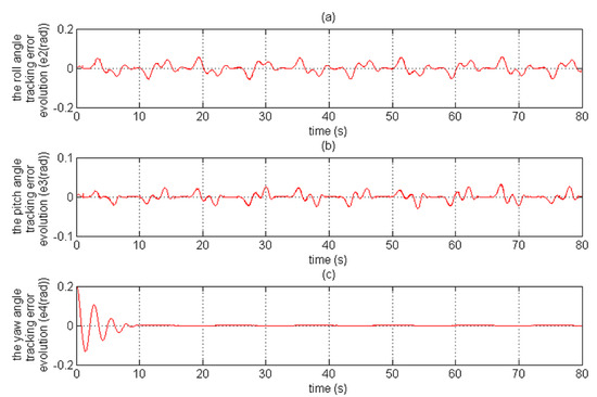 The attitude tracking errors obtained by the CMTC: (a) roll angle error ; (b) pitch angle error ; (c) yaw angle error .