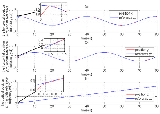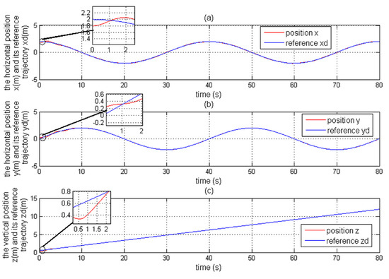 The position tracking evolution obtained by the CMTC: (a) -position (m) and its reference trajectory (m); (b) -position (m) and its reference trajectory (m); (c) -position (m) and its reference trajectory (m).