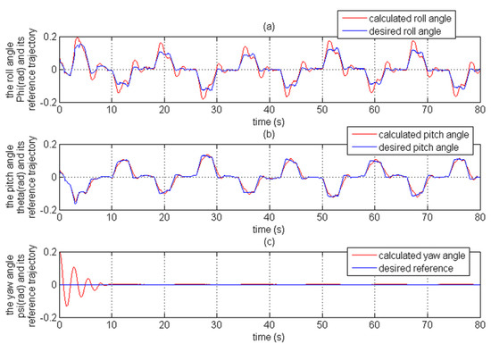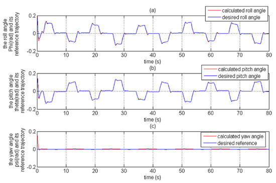 The attitude tracking evolution obtained by the CMTC: (a) roll angle evolution and its reference trajectory ; (b) pitch angle evolution and its reference trajectory ; (c) yaw angle evolution and its reference trajectory .