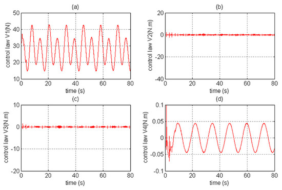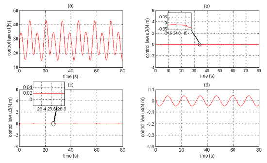 The applied control laws of the CMTC: (a) control law (N); (b) control law (N·m); (c) control law (N·m); (d) control law (N·m).