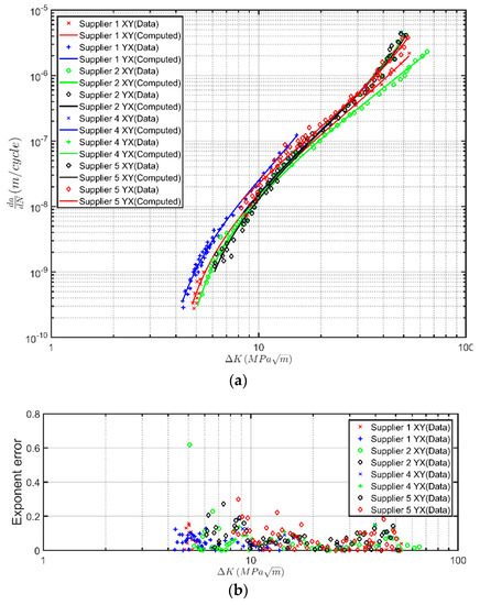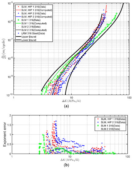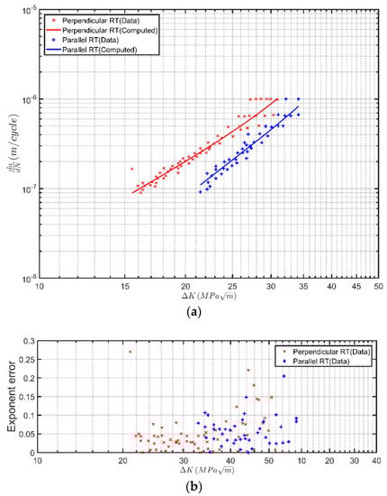 (a) Measured, from [36], and computed crack growth curves in two directions of laser metal wire deposited Ti-6Al-4V; (b) Exponent error of the fitted curves as computed using Equation (5).