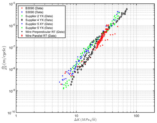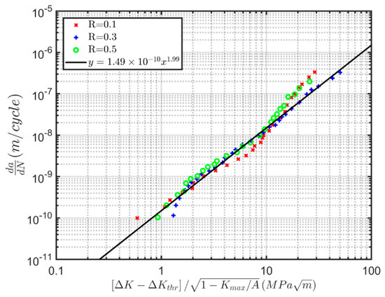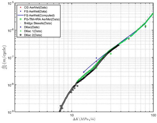 The resultant versus curves are shown in Figure 11. This yields and . The values of and used in Figure 11 are listed in Table 7. The resultant crack growth equation for conventionally manufactured AerMet 100 steel is: