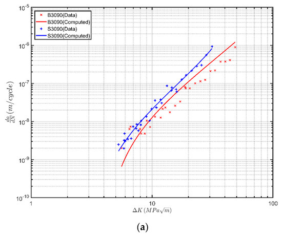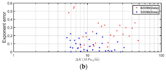 (a) Measured, from [37], and computed crack growth curves in the perpendicular (B3090) and parallel (S3090) directions of SLM-manufactured specimens; (b) Exponent error of the fitted curves as computed using Equation (4).