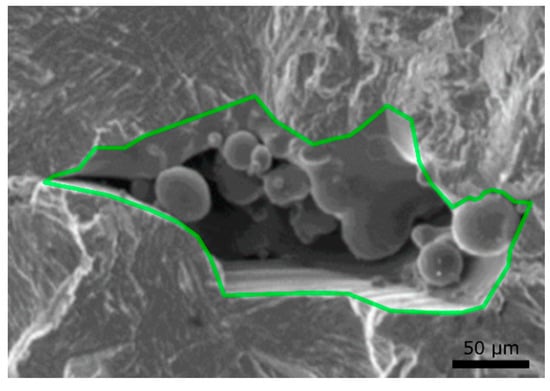 SEM image of the fatigue crack origin, a lack of fusion defect, in the SLM Ti-64, from [39] with its outline (in green) superimposed. Image Courtesy of Dr. Milan Brandt.