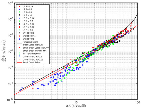 To this end, Figure 6 presents the versus curves associated with the growth of small cracks given in [40] for post-heat-treated LENS Ti-6Al-4V where the surfaces were not machined. For comparison, Figure 6 also presents: