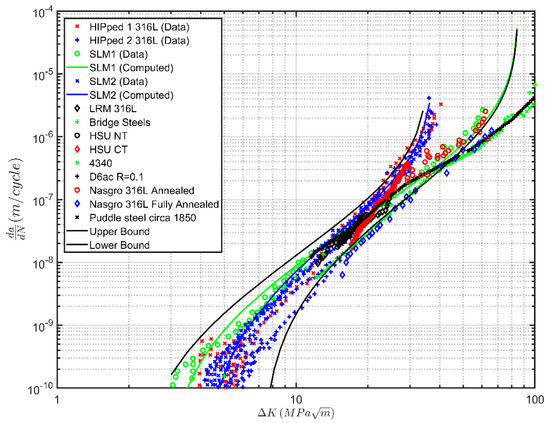 - The crack growth curves given in [47] for the tests on AM 316L steel specimens manufactured using laser rapid manufacturing (LRM).