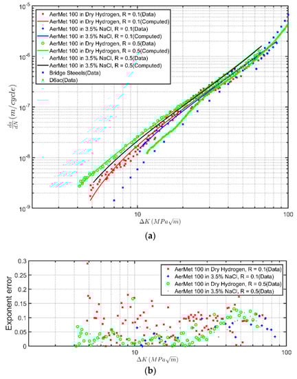 (a) Measured and computed growth in conventionally manufactured AerMet 100 and comparison with crack growth curves for D6ac steel and bridge steels; (b) Exponent error of the fitted curves as computed using Equation (5).