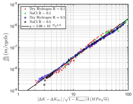 AerMet 100 is widely used for landing gear and fasteners. It is an interesting material in that in the Paris region, it shows very little ratio dependency and is relatively unaffected by the test environment [51]. This is shown in Figure 10, which presents the and data obtained by the US Navy [51] for tests performed in both dry hydrogen and in a 3.5% NaCl environment. For comparison, Figure 10 also reveals that the AerMet 100 versus curves are quite similar to that of D6ac steel (which as shown in [49] is also essentially ratio independent), and the bridge steel versus master curve.