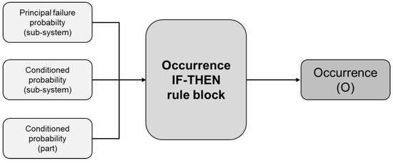 In particular, the inference rule block adopted in the analysis follows the principle of Fuzzy Associative Map inference (FAM) able to guarantee different degrees of support for the relative importance of probabilities in the rule development. The rule-block aggregation overcomes the limitations of a simple mathematical product, supporting an in-depth analysis of failure propagation, still following a systematic perspective. The obtained index, i.e., Occurrence (O), represents one of the three coefficients of the FMECA (see Figure 1), and follows the qualitative scale already presented in Table 1. Therefore, the qualitative parameters in Table 1 remain always valid, and Table 1 even allows associating specific failure rate (if any) with the same scores.