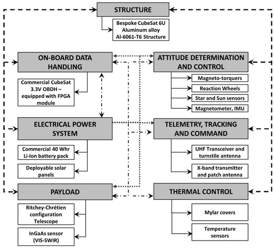 In order to provide a practical application of the proposed analysis method, the SPEC (Stellar Population Evolution on CubeSats) is presented as a case study. The spacecraft was designed during the 2017 Spacecraft Design course at Sapienza University of Rome, given to the second-year students in the Space and Astronautical Engineering MSc. While the main objective of the course is to follow the preliminary design (Phase 0–Phase A [30]) of a CubeSat, the mission aim was presented to the students as input. The SPEC mission is aimed at observing M-Dwarf stars properties, by acquiring and processing the observational data according to the Daemgen method [35]. The designed 6-Units (6U, approximately 20 × 10 × 30 cm, [36]) CubeSat is equipped with a reflecting telescope in Ritchey Chrétien configuration. Part of the designed provisions on the bus components are heritage of former and current CubeSat development and operations projects managed by Sapienza University of Rome ([37,38,39]), whose involvement into the spacecraft development field of research usually brings to the launch of a new CubeSat every few years [33]. The CubeSat has been designed according to a set of preliminary mission requirements, generated by the observables binary systems magnitude, distance and latitude (with respect to the galactic plane). During the design phase, a risk analysis has been performed in order to prioritize the areas of concerns of the system at hand. The analysis results supported the selection of the final layout of the system in terms of choices, strategies, writing or changing of the requirements, developments of figures of merits and mitigation strategies. Following Step 1 of the proposed approach (cf. Section 3.1), the SPEC sub-systems block diagram is presented in Figure 3. The on-board software will be organized as a state machine, with different operative modes to manage the spacecraft tasks and operations. The SPEC Launch and Early Operations will be managed by specific “Commissioning” tasks, such as the deployment of several components or the satellite de-tumbling.