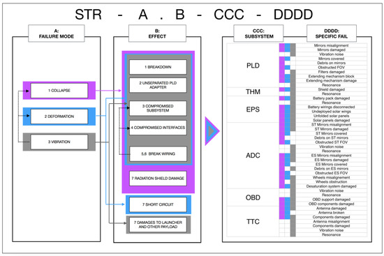 The STR subsystem includes three failure modes. The collapse indicates the fragmentation of structural components. When not considering the breakage of the spacecraft structure, deformation, indicating an unwanted plasticized strain on mechanical parts, or vibration, pointing out a vibrational motion of the structural parts, are taken into account for the analysis. For what concerns the passive thermal control provisions, the Mylar cover may be ripped or punctured (as for the laceration failure mode), as well as being detached from the spacecraft assembly. Both these failure modes may leave uncovered parts of the spacecraft, forcing the internal components to potentially unaffordable thermal cycles, or increasing the risk of damage from external sources, such as micro-meteoroids. As last failure mode considered, the cover degradation mode indicates an excessive exploitation of the insulating material, which leads to a decrease of the insulation performance.