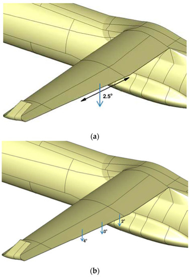 Configurations for the multifunctional TE: (a) Trailing-edge rigid rotation (Mode A) equal to 2.5°; (b) Continuous increase in deflection angles (Mode B) from tip to root (4°/3°/2°).