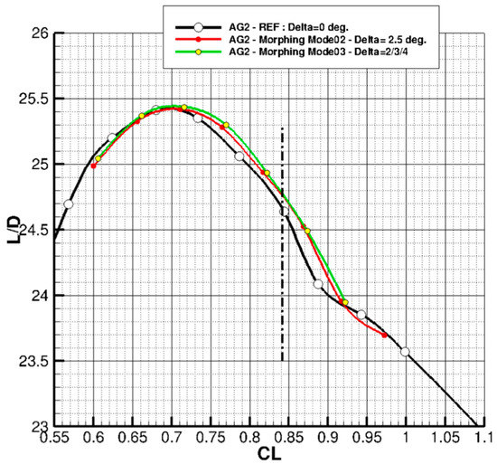 Figure 2 presents the different configurations considered for the multifunctional twistable trailing-edge: a rigid trailing-edge deflection (mode A) equal to 2.5° is presented in Figure 2a, while a discretely increasing distribution of deflection angles along the span (mode B, angles 4°/3°/2°) is sketched in Figure 2b. Figure 3 compares the computed Lift over Drag ratio (L/D) evolution versus in climb conditions for both the mentioned configurations. The L/D for the baseline configuration (no morphing) is also reported in Figure 3. As expected, the efficiency of the trailing-edge morphing concept for the AG2-NLF airplane is visible for high , where an increase of about 0.4 in Lift over Drag ratio is found. More in detail, according to Figure 3, the increase of Lift-over-Drag ratio (L/D) is up to +2% considering the evolution at climb condition ( at ). This value resulted fully compliant with the industrial expectations in terms of benefits brought by the new technology; although marginal at aircraft level, the 2% increase of L/D was indeed considered very relevant at fleet level in force of the very positive impacts on large scale operations.