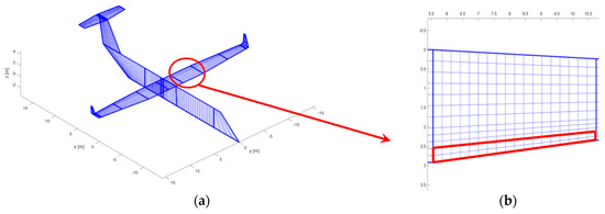 Aerodynamic model used for limit load evaluation by means of DLM: (a) Aerodynamic Lattice of the reference regional aircraft TP90; (b) aerodynamic lattice of the outboard wing trailing-edge.