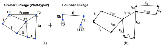 Kinematic model of the inner mechanism: (a) full leverage can be seen as six-bar linkage plus a four-bar linkage; (b) Vector loop equations.