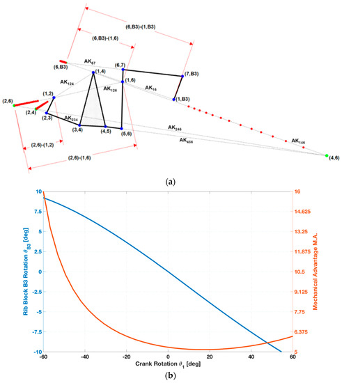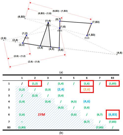 where and are the primary instant centers which respectively coincide with leverage’s fixed hinges (1, 2), (1, 6) and (1, B3). Construction of required instant centers for the inner mechanism, as shown in Figure 10a, is based on the intersection of proper Aronhold-Kennedy (AK) lines. All required ICs for the estimation of the mechanical advantage are summarized in the IC matrix of the linkage (Figure 10b).