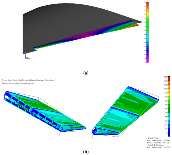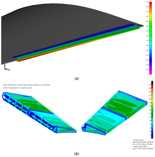 TE finite element analysis with continuous increase deflection angles (Mode B) from tip to root section (+4°/+3°/+2°): (a) Displacement (mm); (b) Strain distribution, Max Principal [MicroStrain].