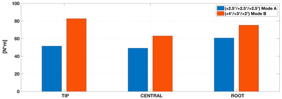 In such cases, the multifunctional twistable trailing-edge used on the AG2-NLF wing is expected to be activated in high speed climb flight conditions. To enable the transition from baseline configuration to the rigid trailing-edge deflection (mode A) equal to 2.5°, all rotary brushless motors have to be activated (R1, R2 and R3) transferring to their respective “active” ribs the same angle. In this case, the actuating torques required to enable this transition are reported in Figure 18.