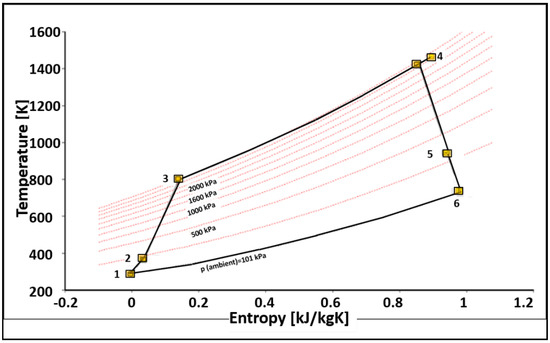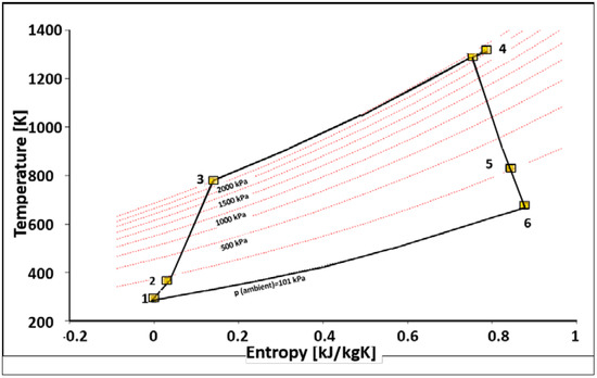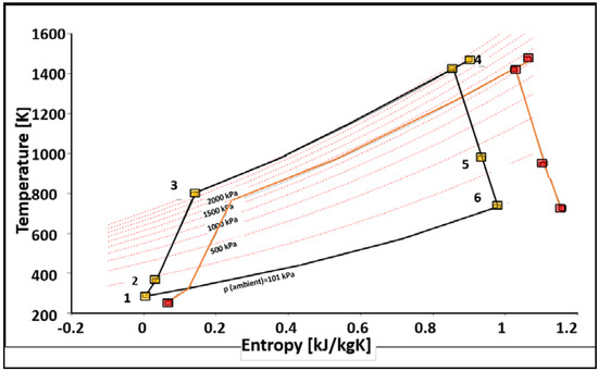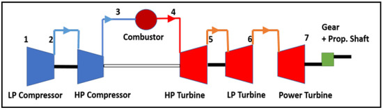 The turbine inlet temperature (TIT) at the maximum power take-off condition was also unknown, but it was assumed to be 100 °C greater than the maximum cruise TIT [22]. In Figure 2 and Figure 3, the PW120 gas turbine scheme and the thermodynamic cycle at the design point are reported, respectively; the results are obtained assuming that the engine is a two spool turboprop, with a booster on high spool.