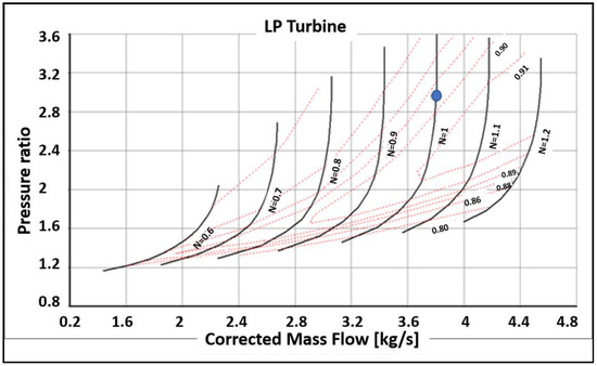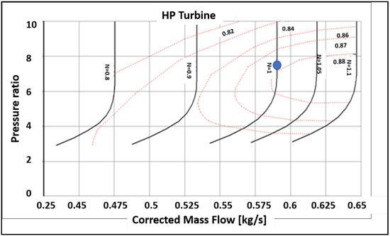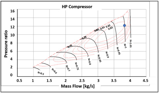 Starting from the single cycle design point, some off-design simulations have been performed. Naturally, if more accurate simulations of a specific engine are desired, then special compressor and turbine maps should be used. Unfortunately, the company has never declared the component maps of the PW100 series, so there are different ways to obtain these maps with an admissible accuracy. In fact, it is important to underline that, because of the lack of knowledge of the real component maps, it can be possible to obtain estimated maps to try to minimize the gap from the real ones. In order to estimate the component maps, it is possible by either scaling maps of other components with similar characteristics or computerizing data from the PW120 compressor and turbine maps present in literature (Figure 4, Figure 5 and Figure 6).