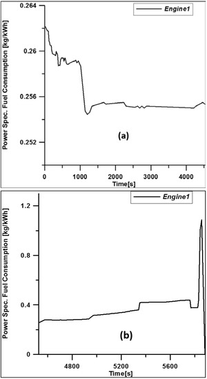 In particular, in Figure 11, the shaft power is plotted during the mission phases: the maximum value is reached during the take-off phase. The profile of power is calculated through the implementation of mechanical flight equations [24] in a MATLAB script; using as input data, the aerodynamics data of ATR42-300 (Table 2) and the altitude and speed profile, the values of the power in each point of the flight mission are calculated. In Figure 12, the specific fuel consumption (BSFC) is shown, with the left (a) and right sides (b) being several mission phases characterized by different scales; the lower value is obtained at the beginning of the cruise at load variation, at that point, keeping a rather constant value. According to the trend of required power, the thrust presents the maximum value at flight starting (take-off). The results obtained in Figure 11 are crucial for building the hybrid system. During the cruise phase, the power of the turbine is lower than the take-off and climbing phase: this could allow the use of a smaller size turboprop with a reduced nominal power until the power cruise phase, and supply the difference in power between the cruise power and the maximum power using an electric motor.