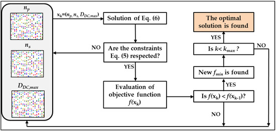 Considering a set of np, ns, and DDC,max, generated as a random uniform distribution, the mathematical model (6) is solved. If the constraints (5) are satisfied, the sets (np, ns, DDC,max) become feasible solutions for the problem, and the value of the objective function is stored. If the value of the objective function at kth iteration is less than the value at (k − 1)th iteration, a new optimal solution is found. If the total number of iterations reaches the value kmax (in our case, 2 × 106), the last stored solution becomes the optimal solution.