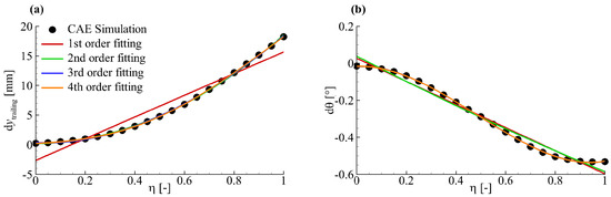 Polynomial fitting of bending and torsion of a large aspect ratio wing: (a) bending at trailing edge; (b) wing section torsion.