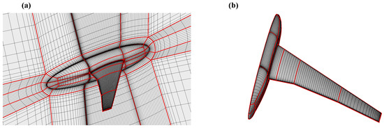 Figure 3 gives the CFD grid used in this validation case. This multiblock grid is generated by the AePW organizing committee and provided to submitters to use in the first AePW. There are 319 blocks, 3,158,849 grid nodes, and 3,088,384 grid cells in this grid. An O-type grid is generated around the wing and body to simulate the boundary flow. The thickness of the first layer is 4.4 × 10−7 m, and the corresponding is 0.66 for of 1.4 × 107. This CFD grid can be downloaded from the AePW website where more information about this grid is provided. In the following parametric analysis, this CFD grid continues to be used to obtain aerodynamic forces on rigid and elastic shape.