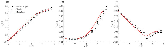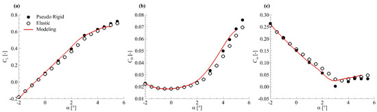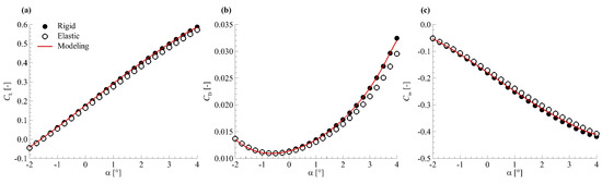 From Equation (15), the value of aerodynamic force coefficients at any can be calculated directly. For rigid model shape, the wing section torsion is zero. As a result, the parameter of rigid shape is . The aerodynamic force coefficients on the rigid model shape can be obtained by subsituting this value of into Equation (15), shown as follows: