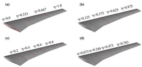 Two cases are selected for use in this section from the available data. Table 3 gives the parameters of the two selected cases. In Table 3, is the serial number of the wind tunnel test in which model deformation are measured. is the serial number of wind tunnel test in which aerodynamic forces are obtained. q is the flow dynamic pressure and E is the Young’s module of the material of which the wind tunnel model is made. The ratio is called loading factor, which is used to describe the magnitude of wing structure deformation under aerodynamic loads.
