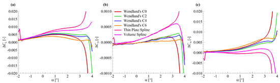 In this subsection, the effects of basis function type on aerodynamic force modelling are evaluated. Six basis functions were selected for comparison. These basis functions involve four compact Wendland’s functions (C0, C2, C4, C6) and two globe basis functions (Thin Plate Spline, Volume Spline). Figure 9 shows the aerodynamic force modelling results for the HIRENASD wing model with the six different basis functions. All the modelling parameters in Figure 9 are the same as that in modelling case in Section 3.3, except the basis function type.
