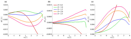 Aerodynamic force modelling results for the HIRENASD wing model with different support radius values: (a) ; (b) ; (c) .