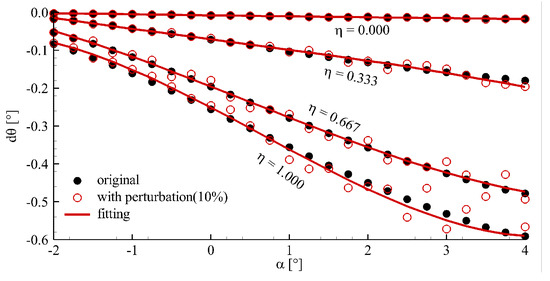 Figure 11 shows the wing section torsion with and without perturbation. Here, the amplitude of perturbation is 10.0%. ‘-’ in Figure 11 represents the three-order polynomial fitting of wing section torsion with perturbation.