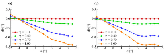 The geometric angle of attack, , which equals the angle of attack of the wing root section, can also be determined by the angle of attack at four wing sections: . Therefore, Equation (9) can be changed into