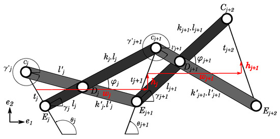 Figure 3 represents the geometric representation of a generic planar SSM. In Figure 3, and are two straight bars that form the jth SLE of the SSM. , and , represent section lengths, and and represent the orientations about the global coordinates of those straight bars, respectively. When another SLE is attached to the jth SLE and letting the SLE, there occurs a closed-loop , which is a “quadrilateral”. This closed-loop can be expressed in complex notation as:
