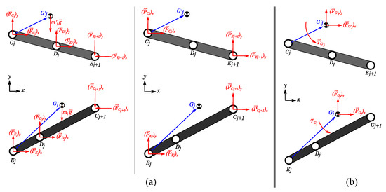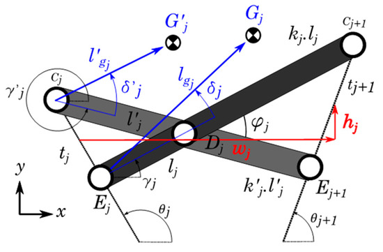 In Figure 4, and represent the mass centers of links that construct an SLE; , and , represent the position vectors of the mass centers and the angles between the corresponding link and the mass center vector of that corresponding link, respectively.