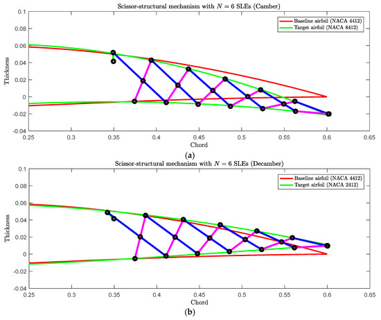 Scissor-structural mechanism with N = 6 SLEs at the deployed position when the target airfoil was: (a) NACA 8412; (b) NACA 2412.